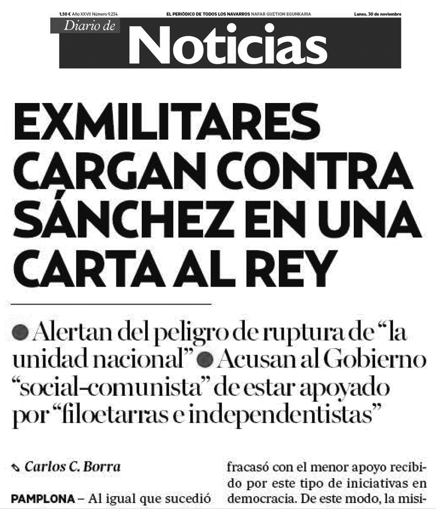 Inceíble pero ciero –salvo desmentido– que ciudadanos españoles del siglo XXI –exmilitares, que no custodios de las eternas esencias patrias ni vigías de Occidente–, cual soldadesca levantisca, anden agitando espantajos –el «social-comunismo», el «filoterrorismo»…– propios de la dictadura chilena de hace medio siglo o de los militares golpista españoles de hace un siglo. Pero no solo parece ser así. No solo tales señores exhiben en público su herencia más impresentable en sociedad, sino que incluso trasladan al jefe del Estado sus exigencias de forma imperativa. Como quien se tiene a sí mismo por el cirujano llamado a intervenir cuando él mismo considere que la salud del enfermo así lo exige.
