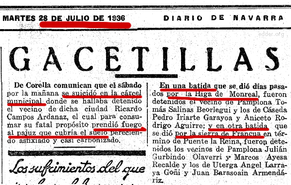 • 28 de julio de 1936: concejal y juez de paz republicano «suicidado» (quemado vivo) en la cárcel de Corella y «batidas de caza» por Monreal y Puente la [...]